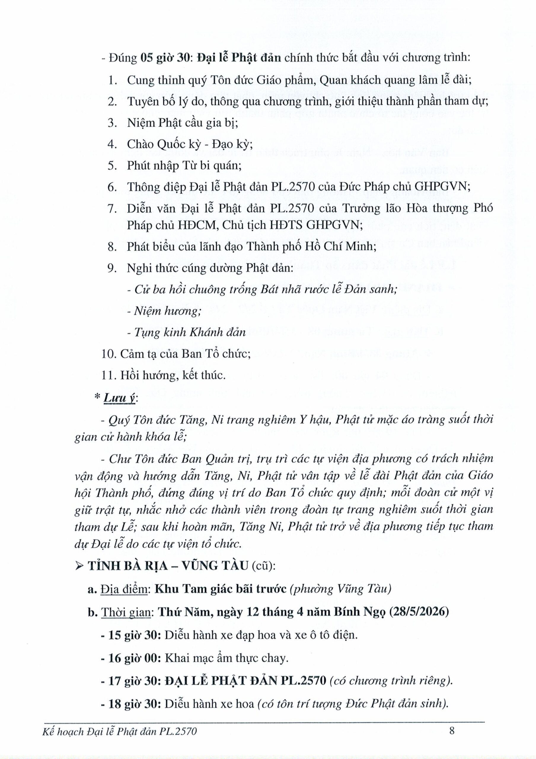 Tại khu vực Bà Rịa – Vũng Tàu (cũ), Đại lễ sẽ tổ chức tại khu Tam giác Bãi Trước (phường Vũng Tàu) vào tối ngày 28/05/2026, với các hoạt động diễu hành xe hoa, văn nghệ và nghi lễ Phật đản. Khu vực Bình Dương (cũ) tổ chức tại tổ đình Hội Khánh vào ngày 26/05/2026.