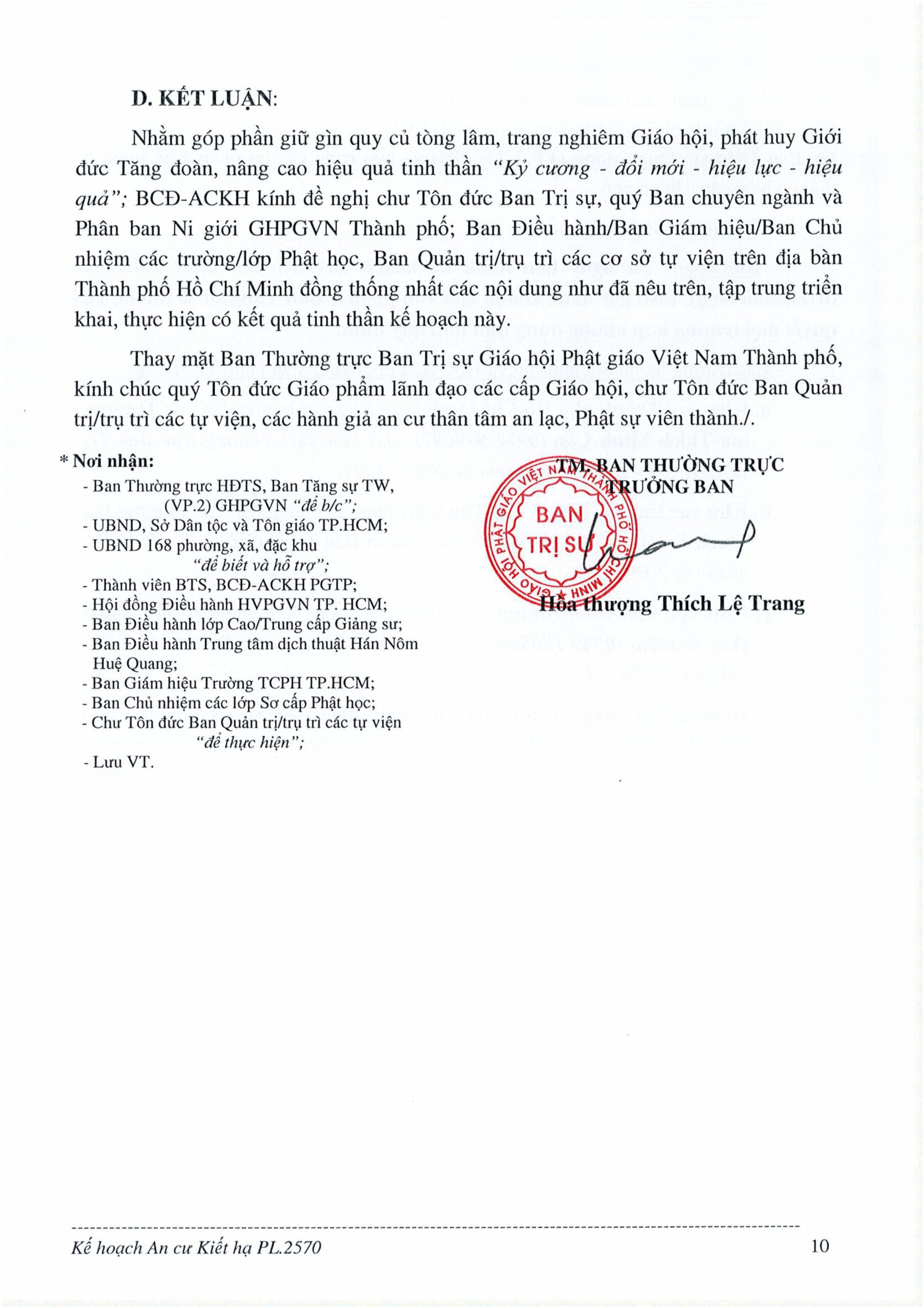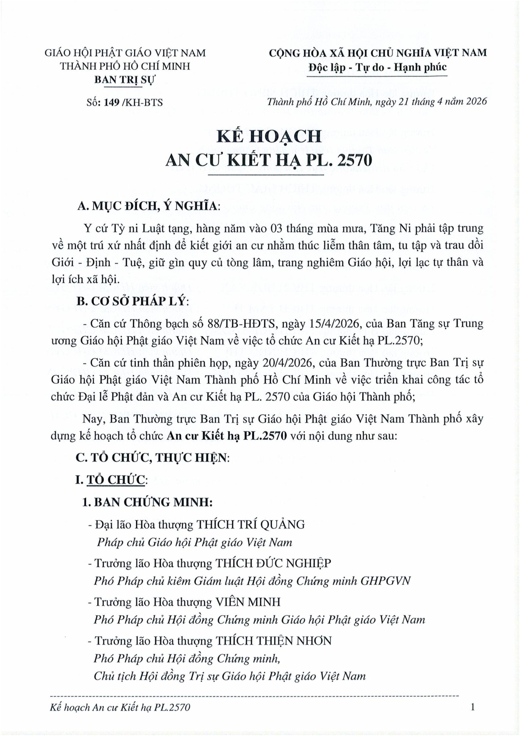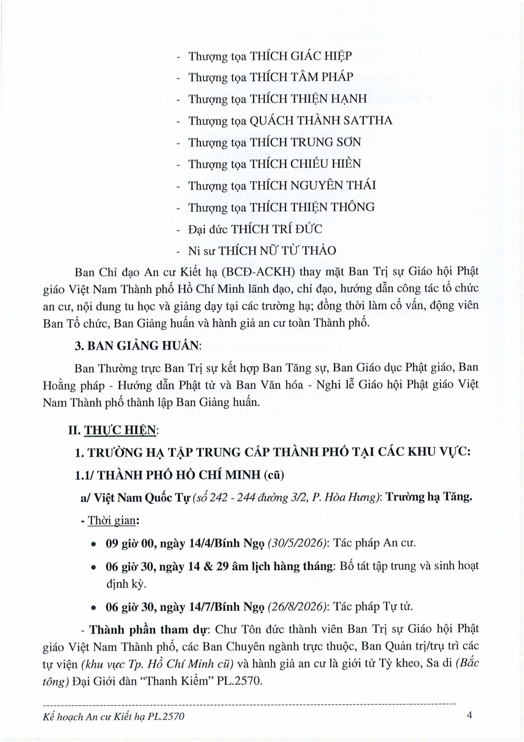 Theo Kế hoạch số 149/KH-BTS do Hòa thượng Thích Lệ Trang, Phó Chủ tịch Hội đồng Trị sự, Trưởng ban Trị sự GHPGVN TP.HCM, ký ban hành ngày 21/04/2026, công tác An cư kiết hạ Phật lịch 2570 của Phật giáo TP.HCM được triển khai nhằm giữ gìn quy củ tòng lâm, trang nghiêm Giáo hội, phát huy giới đức Tăng đoàn và tạo điều kiện để Tăng Ni thúc liễm thân tâm, trau dồi giới – định – tuệ. Kế hoạch được xây dựng trên cơ sở Thông bạch của Ban Tăng sự Trung ương và tinh thần phiên họp ngày 20/04/2026 của Ban Thường trực Ban Trị sự GHPGVN TP.HCM.