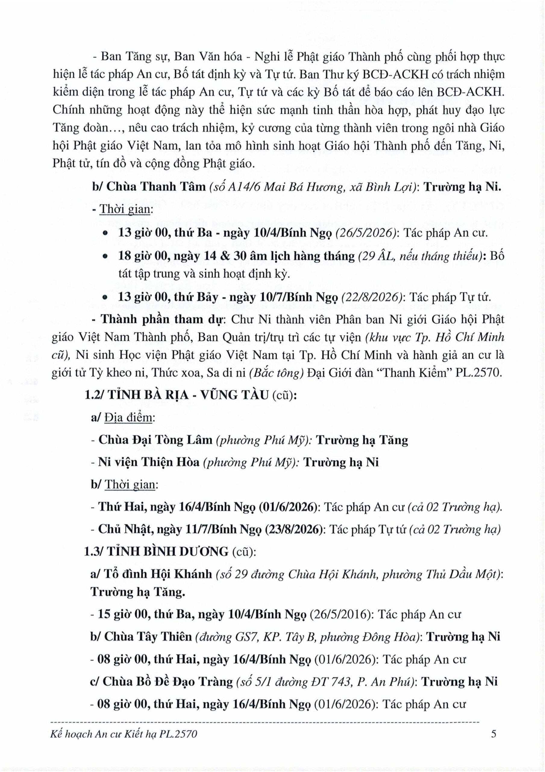 Kế hoạch cũng nêu rõ công tác kiểm Tăng, thăm các trường hạ, cùng thủ tục hành chính trong đăng ký tổ chức an cư. Hồ sơ đăng ký tổ chức an cư và danh sách hành giả phải gửi về Ban Tăng sự GHPGVN TP.HCM đúng thời hạn. Theo quy định, thời gian tiếp nhận hồ sơ kéo dài từ ngày ban hành kế hoạch đến hết ngày 23/05/2026; quá thời hạn trên, Ban Tăng sự sẽ không giải quyết.
