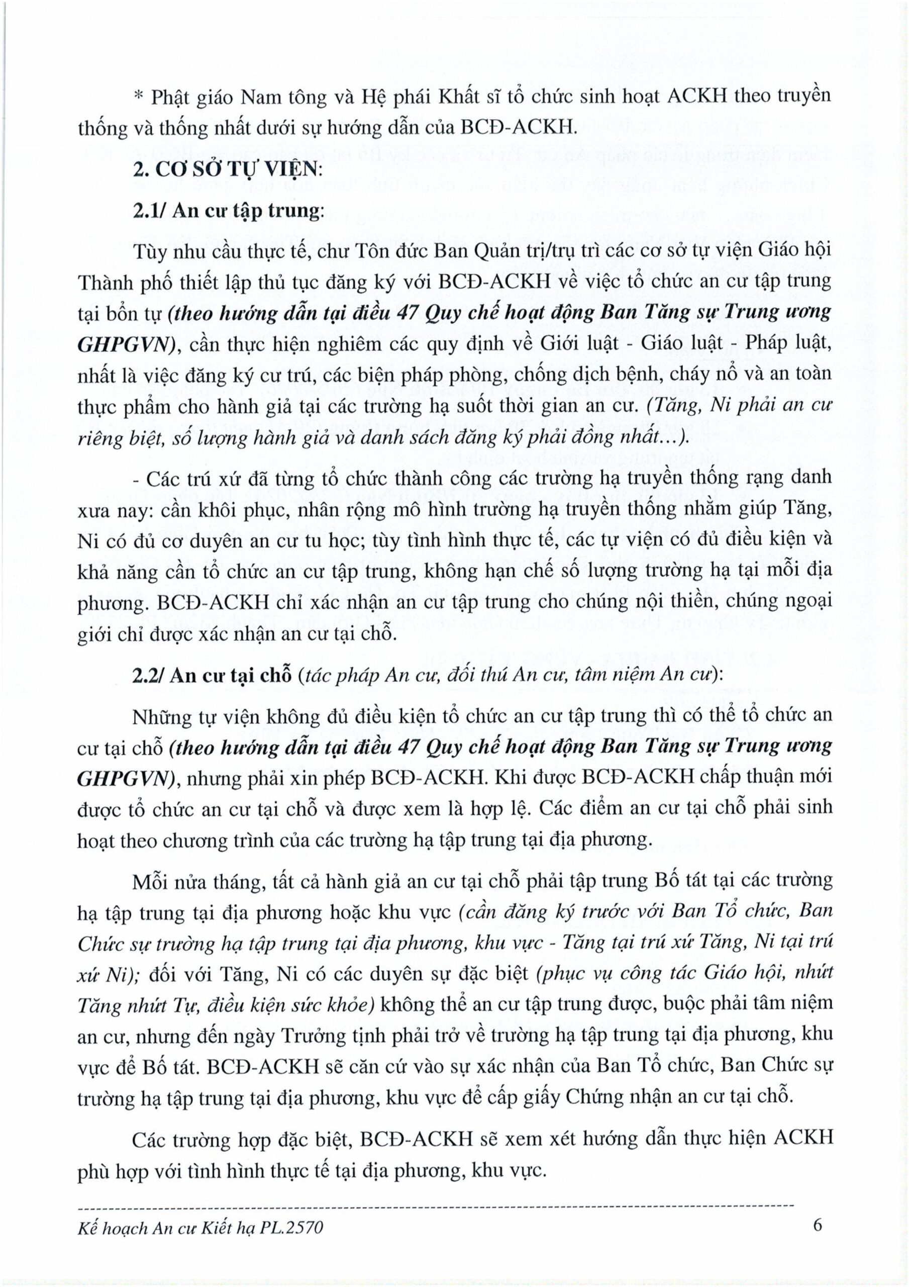 Kế hoạch đồng thời quy định rõ việc tổ chức an cư tập trung tại các tự viện đủ điều kiện, an cư tại chỗ đối với các trường hợp không thể tập trung, cũng như yêu cầu Tăng, Ni an cư riêng biệt, danh sách hành giả phải thống nhất và thực hiện đầy đủ các quy định về cư trú, an toàn, phòng cháy chữa cháy và vệ sinh thực phẩm. Mỗi nửa tháng, hành giả an cư tại chỗ phải tập trung Bố-tát tại các trường hạ tập trung khu vực theo quy định.