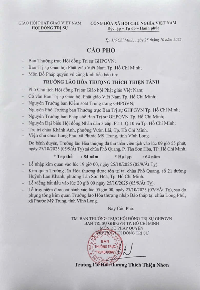 PGTPHCM – Ngày 25/10/2025, Trưởng lão Hòa thượng Thích Thiện Nhơn – Chủ tịch hội đồng trị sự Giáo hội Phật giáo Việt Nam ký cáo phó thông báo Trưởng lão Hòa thượng Thích Thiện Tánh vừa viên tịch.