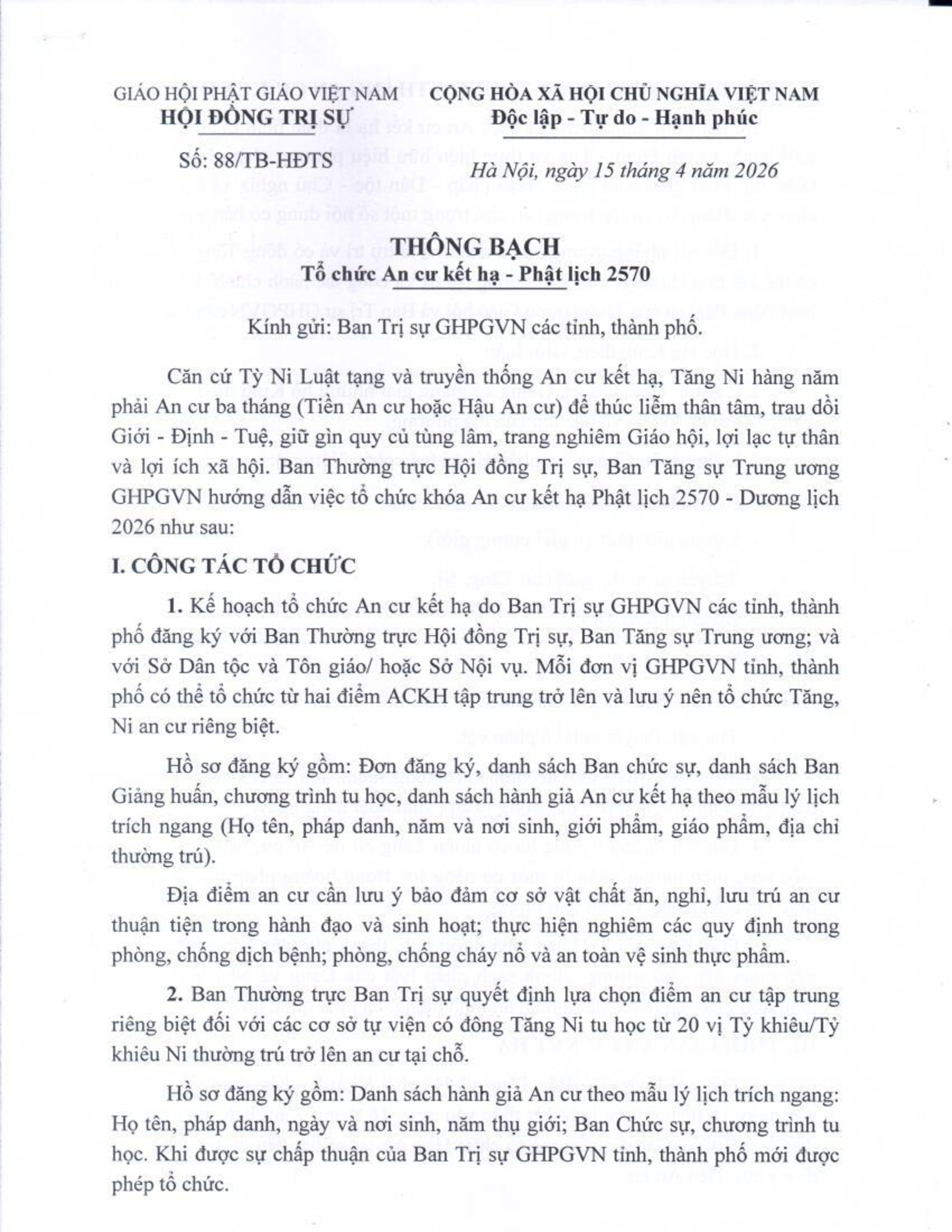 PGTPHCM – Ngày 15/4/2026, tại Hà Nội, Hội đồng Trị sự Giáo hội Phật giáo Việt Nam ban hành Thông bạch số 88/TB-HĐTS về việc tổ chức An cư kết hạ Phật lịch 2570 – Dương lịch 2026.