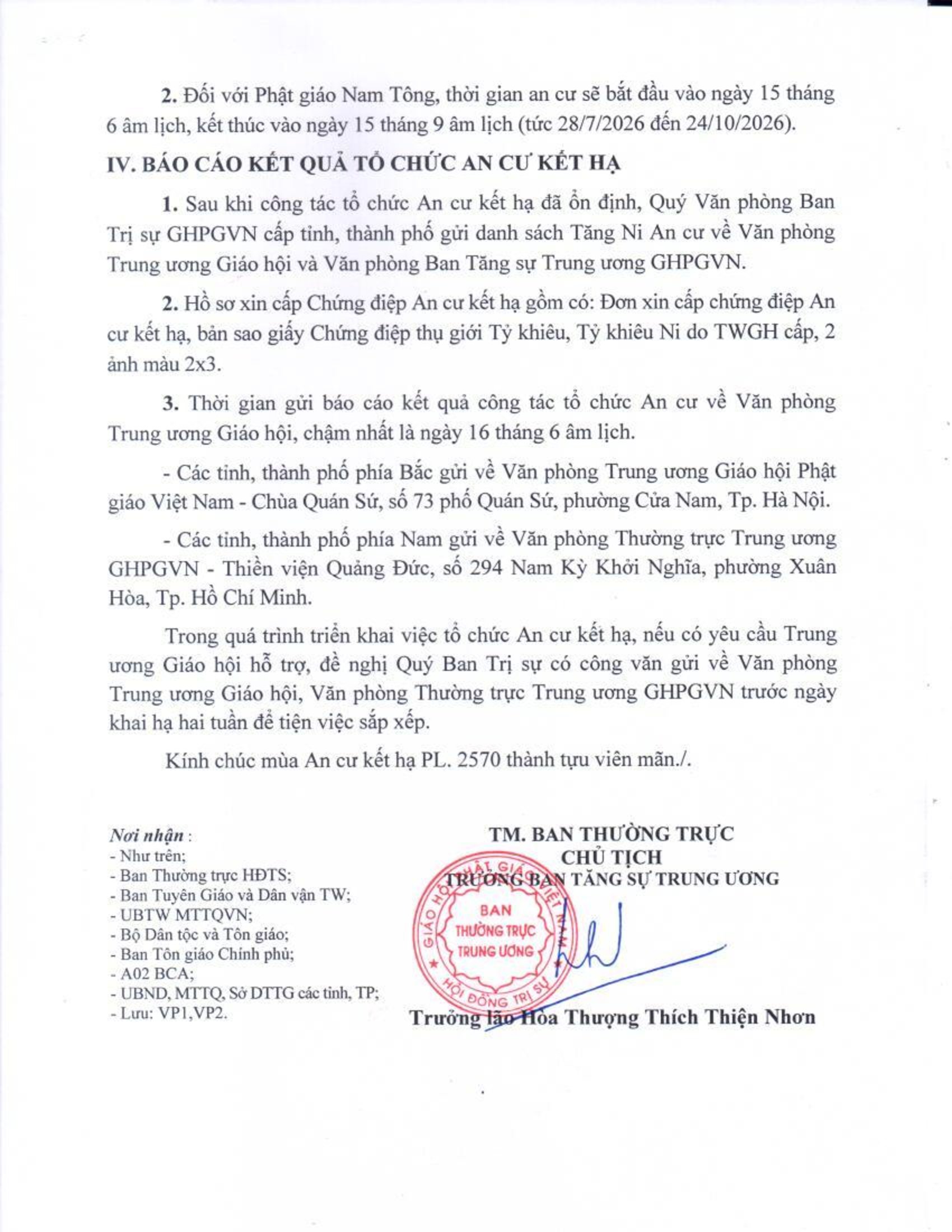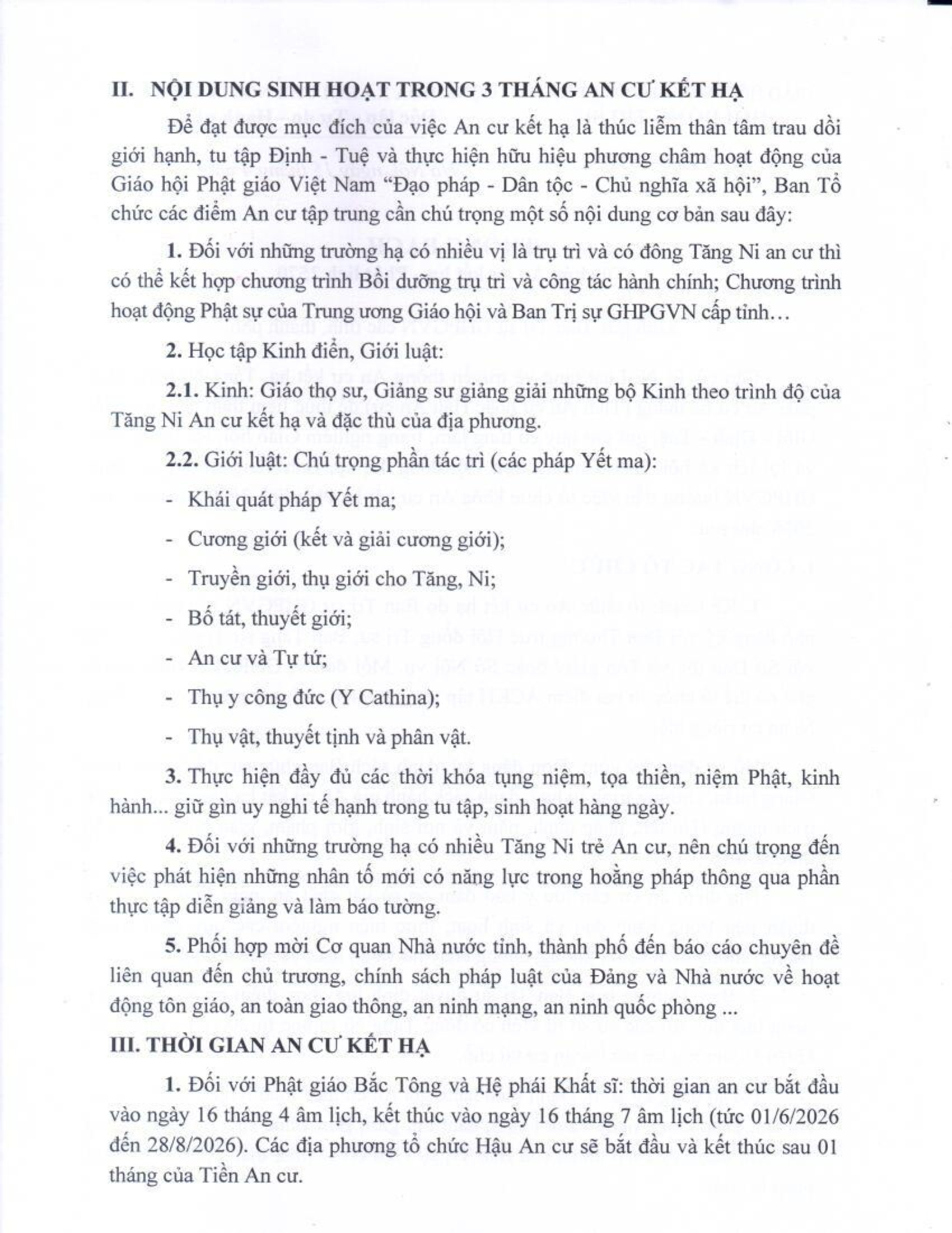 Thông bạch cũng quy định việc báo cáo kết quả tổ chức, cấp chứng điệp an cư và đề nghị các Ban Trị sự phối hợp với cơ quan chức năng, truyền thông nhằm bảo đảm mùa An cư kết hạ diễn ra trang nghiêm, đúng pháp luật và đạt hiệu quả tu học.