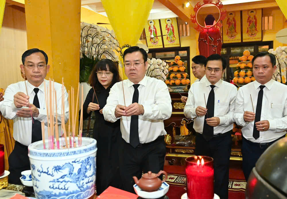 Tháp tùng phái đoàn có ông Nguyễn Văn Nên – Uỷ viên Bộ Chính trị, Thường trực Tiểu ban Văn kiện Đại hội XIV của Đảng, phụ trách theo dõi, chỉ đạo Đảng bộ TP.HCM; ông Trần Lưu Quang – Bí thư Trung ương Đảng, Bí thư Thành uỷ TP.HCM; cùng các vị lãnh đạo ban, ngành, chuyên viên trực thuộc Thành ủy, HĐND, UBND, đại diện các đoàn thể chính trị xã hội, tôn giáo thành viên MTTQVN TP.HCM.