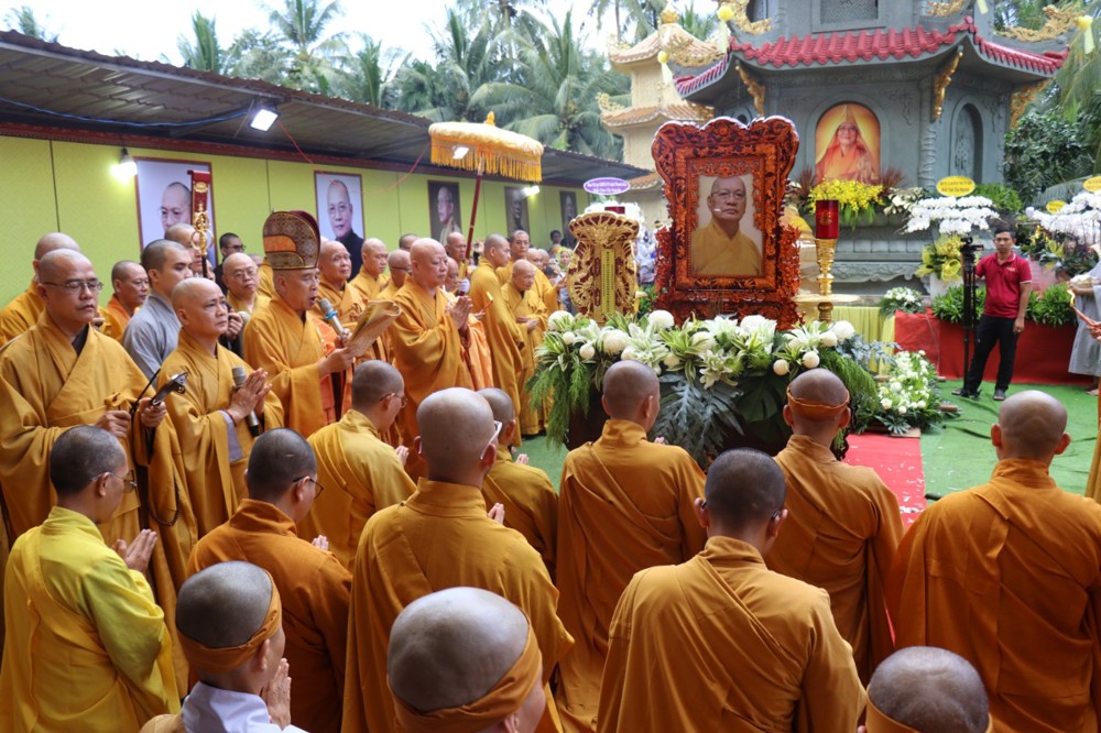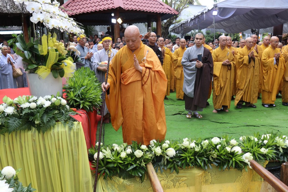 Sau nghi thức lễ truy niệm, chư tôn đức đã cử hành lễ cung thỉnh kim quan rời chùa Phổ Quang, phụng tống hồi hương về Vĩnh Long.