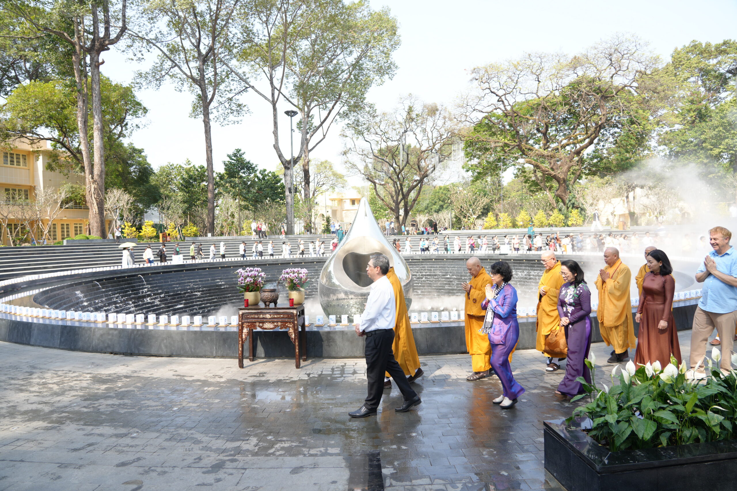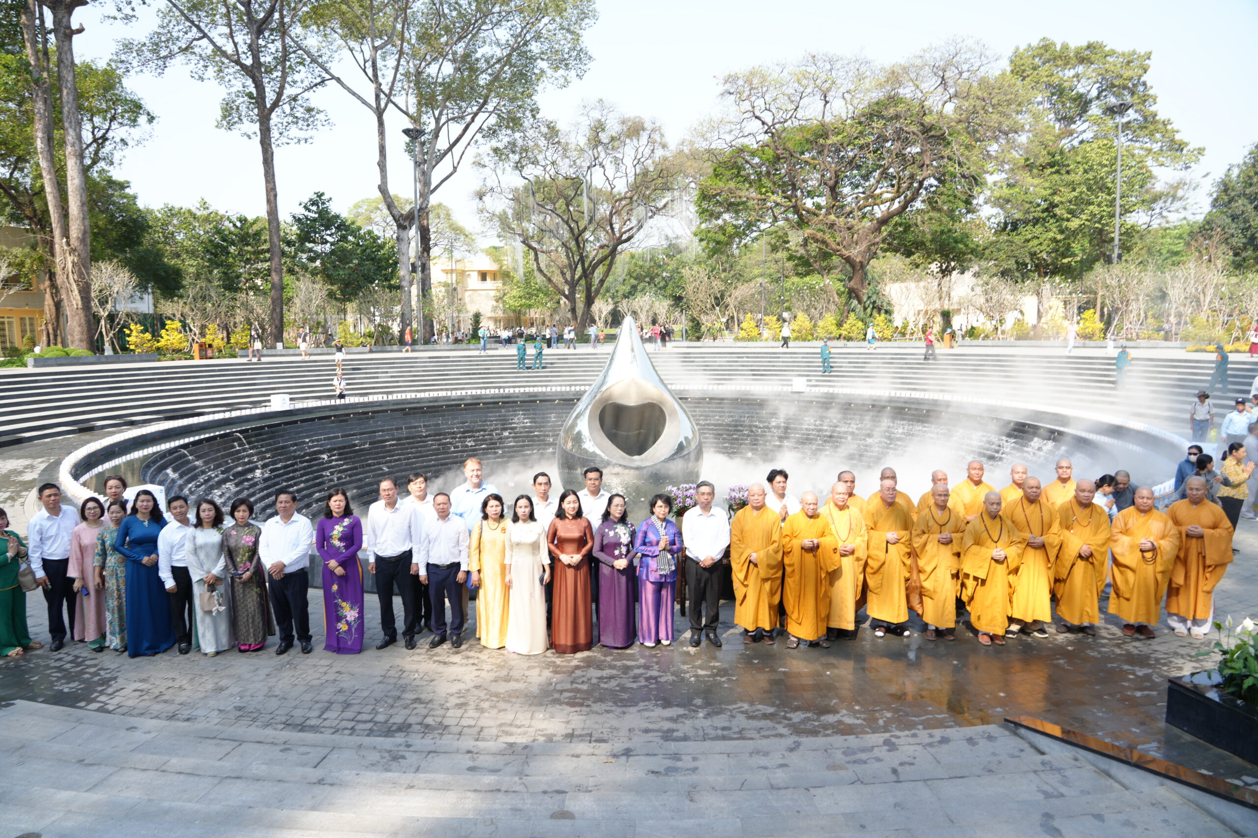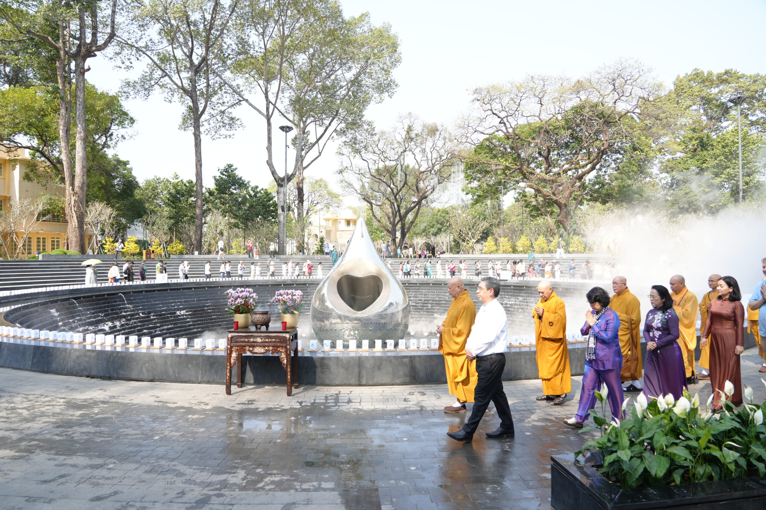 Sau khi hoàn mãn khóa lễ khai đàn cầu nguyện quốc thái dân an tại Việt Nam Quốc Tự, phái đoàn Ban Thường trực Ban Trị sự GHPGVN TP.HCM do Hòa thượng Thích Lệ Trang – Phó Chủ tịch Hội đồng Trị sự, Trưởng ban Trị sự GHPGVN TP.HCM – làm trưởng đoàn đã đến khu vực tượng đài “Giọt nước” trong công viên để cử hành nghi thức tưởng niệm và kỳ siêu dành cho đồng bào, lực lượng tuyến đầu đã mất trong đại dịch.