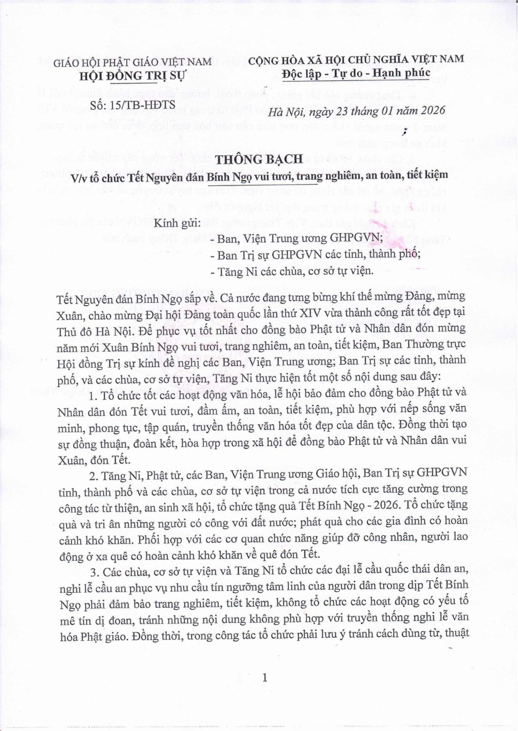 PGTPHCM – Ngày 23/01/2026, Văn phòng Trung ương GHPGVN cho biết Trưởng lão Hòa thượng Thích Thiện Nhơn – Phó Pháp chủ Hội đồng Chứng minh, Chủ tịch Hội đồng Trị sự đã ấn ký phổ biến Thông bạch số 15/TB-HĐTS về việc tổ chức Tết Nguyên đán Bính Ngọ 2026 theo tinh thần vui tươi, trang nghiêm, an toàn, tiết kiệm, gửi đến các Ban, Viện Trung ương, Ban Trị sự các tỉnh, thành phố và chư Tăng Ni các tự viện trên toàn quốc.