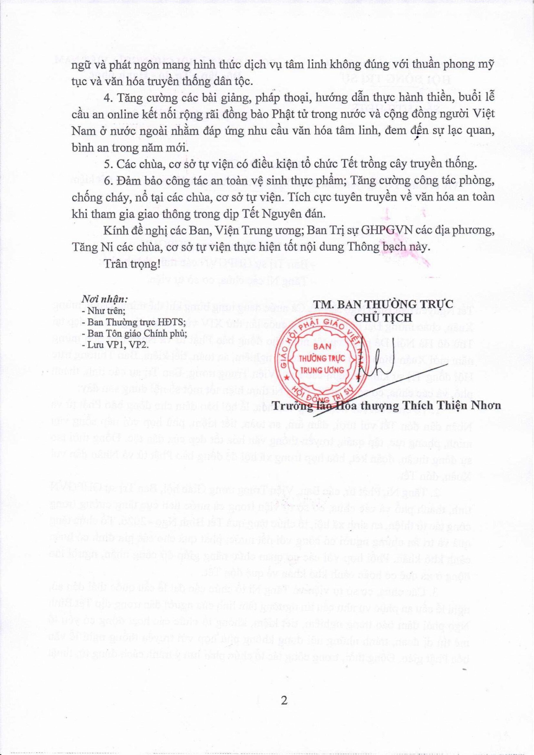 Thông bạch đề nghị các đơn vị, tự viện tổ chức hoạt động văn hóa, lễ hội phù hợp nếp sống văn minh và truyền thống dân tộc; tăng cường từ thiện – an sinh xã hội, tặng quà Tết, tri ân người có công, hỗ trợ gia đình khó khăn và người lao động xa quê; tổ chức các lễ cầu quốc thái dân an, cầu an trang nghiêm, tiết kiệm, không để xảy ra mê tín dị đoan, tránh cách dùng từ, thuật ngữ mang tính “dịch vụ tâm linh”; đẩy mạnh pháp thoại, hướng dẫn thiền, lễ cầu an trực tuyến kết nối Phật tử trong và ngoài nước; vận động Tết trồng cây tại các cơ sở đủ điều kiện; đồng thời bảo đảm an toàn vệ sinh thực phẩm, phòng chống cháy nổ và tuyên truyền an toàn giao thông trong dịp Tết.