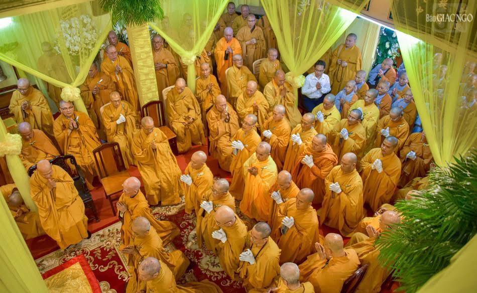 Dưới sự dẫn lễ của Hòa thượng Thích Lệ Trang – Phó Chủ tịch Hội đồng Trị sự, Trưởng ban Trị sự GHPGVN TP.HCM, chư tôn đức và hội chúng đồng thanh tụng chú Đại bi, Bát-nhã tâm kinh. Tiếp đó, Trưởng lão Hòa thượng Thích Huệ Minh – Ủy viên Thường trực Hội đồng Chứng minh cử hành nghi thức sái tịnh kim quan và nhục thân Trưởng lão Hòa thượng tân viên tịch.