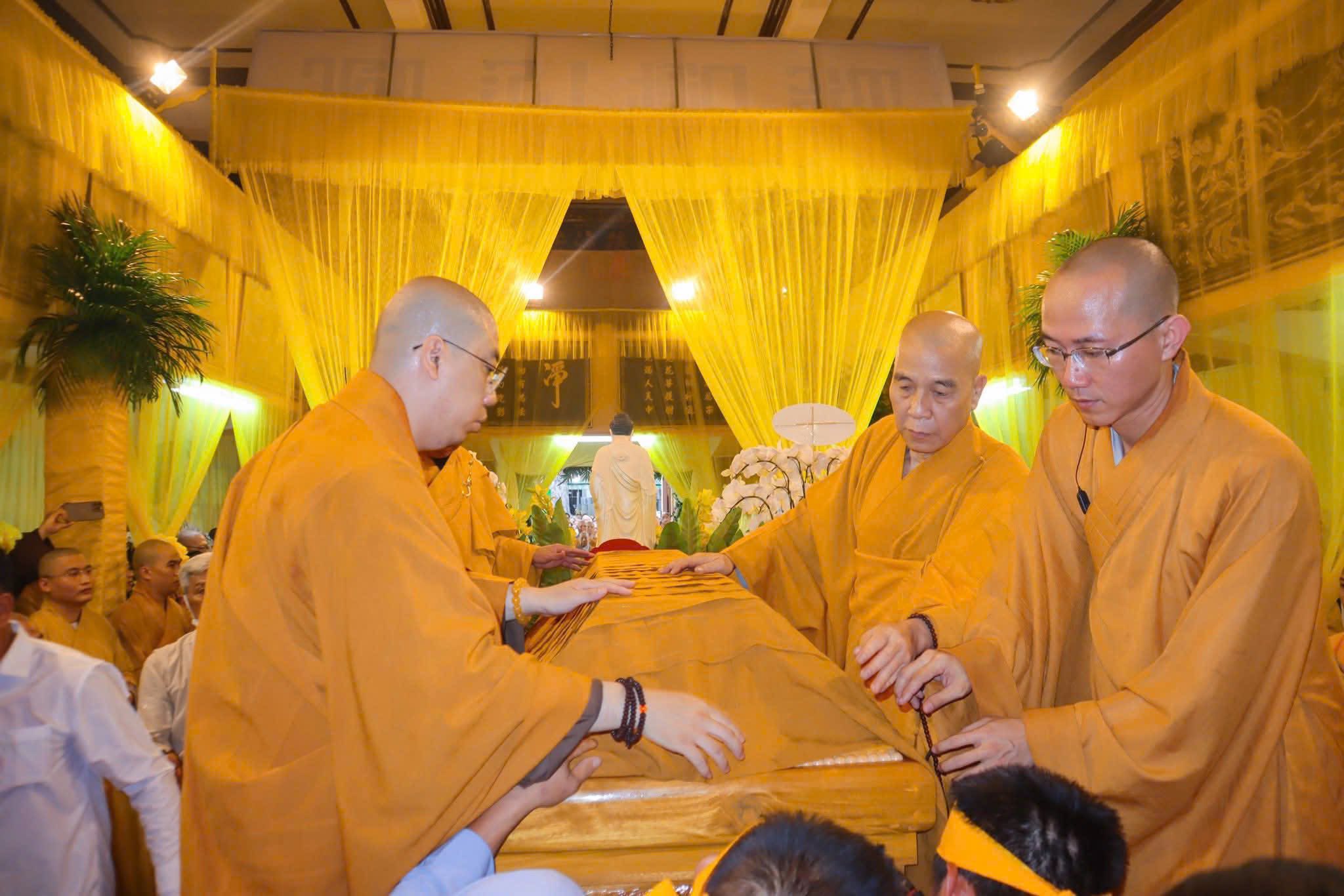 Trong tiếng niệm Phật nhất tâm của chư Tăng Ni và Phật tử, môn đồ pháp quyến đã cung thỉnh nhục thân Trưởng lão Hòa thượng từ phương trượng đến Giác linh đường để cử hành nghi thức nhập kim quan.