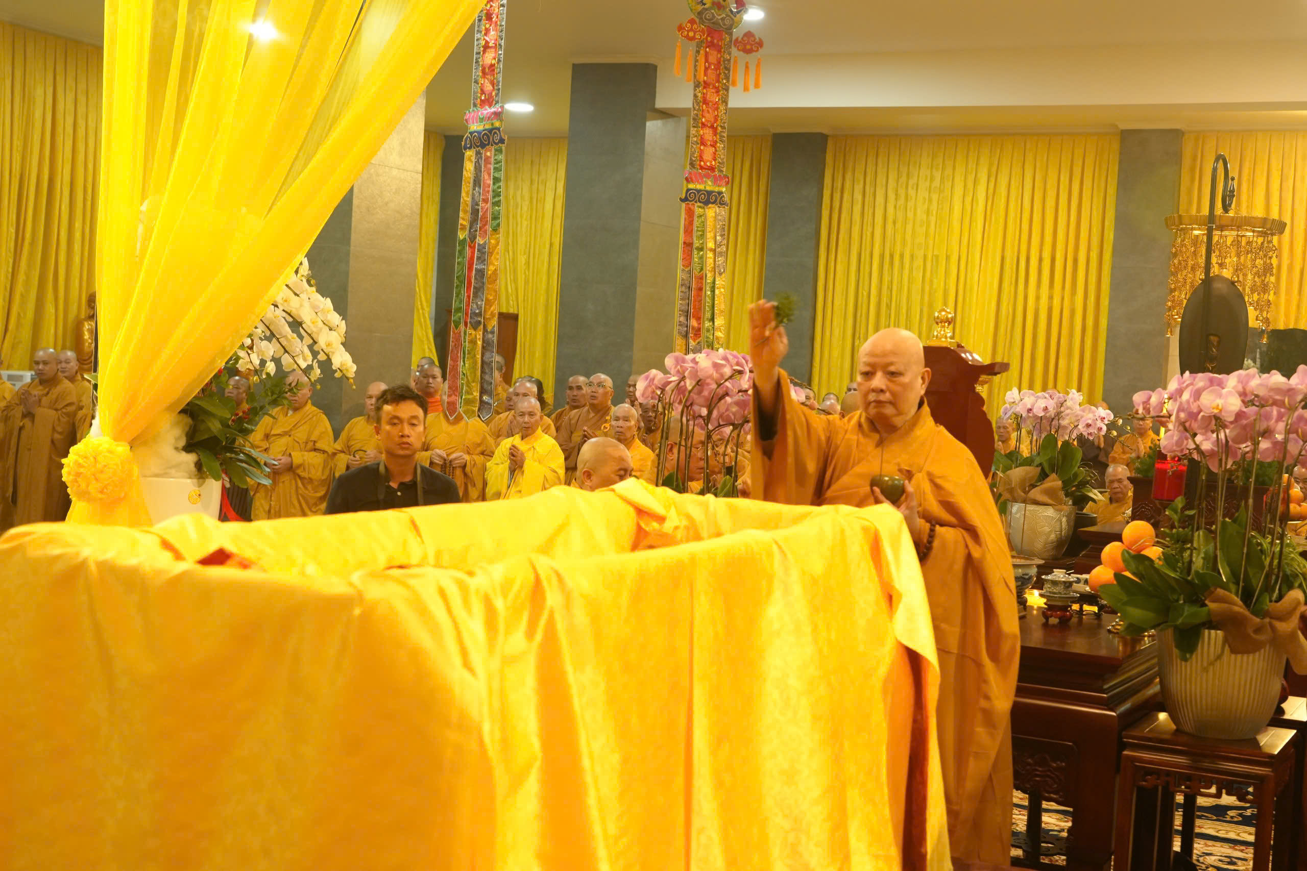 Tại Giác linh đường, nơi tôn trí kim quan cố Trưởng lão Hoà thượng Thích Thiện Tánh, chư vị giáo phẩm cử hành nghi thức niệm hương bạch Phật cầu nguyện, đồng thanh trì tụng Đại bi tâm kinh Đà La Ni hoà trong tiếng chuông trống Bát nhã trầm hùng, Hoà thượng Thích Lệ Trang – Phó Chủ tịch Hội đồng Trị sự, Trưởng Ban Nghi lễ TƯ, Trưởng Ban Trị sự kiêm Trưởng Ban Tăng sự GHPGVN TP.HCM đương vi sám chủ và sái tịnh kim quan sau đó các pháp tử của Trưởng lão Hoà thượng nhẹ nhàng cung thỉnh thân tứ đại của Ngài phủ pháp y của người xuất gia, từ thiền thất hướng đến Giác linh đường trong lời niệm Phật A Di Đà đồng thanh của chư Tăng Ni và đông đảo Phật tử.