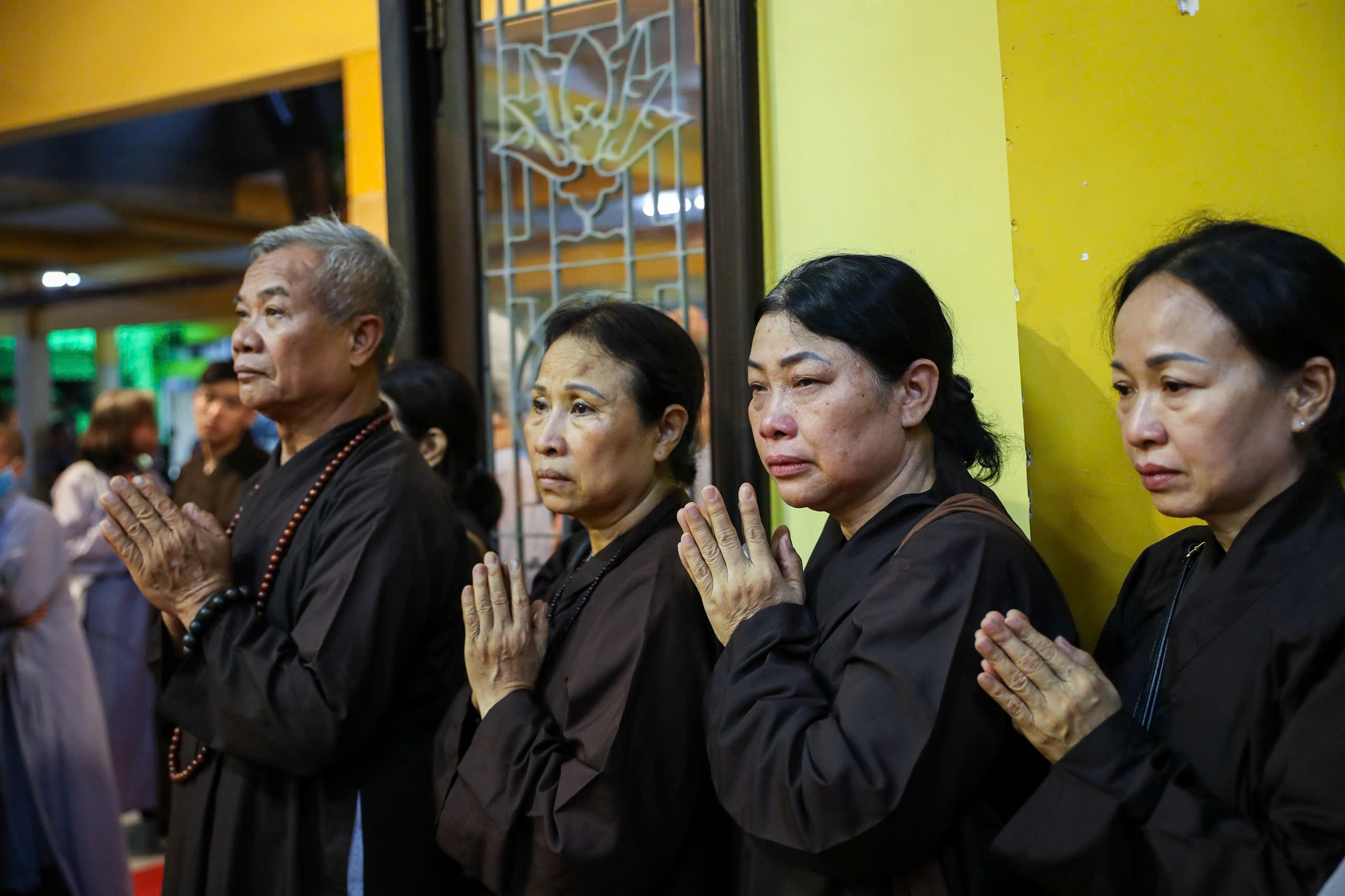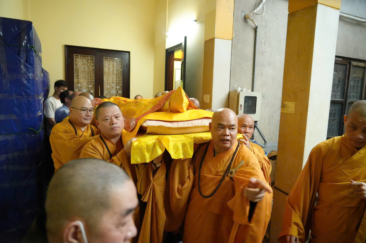 Chư vị đại diện sơn môn pháp phái, môn đồ đệ tử đã cung thỉnh nhục thân của Trưởng lão Hòa thượng từ thiền thất đến Giác linh đường – Tổ đình Vĩnh Nghiêm nhập kim quan. Chư Tôn đức giáo phẩm, Tăng Ni và Phật tử hiện diện chắp tay, chánh niệm đồng niệm Phật A Di Đà trong âm vang trầm hùng của chuông trống Bát nhã.
